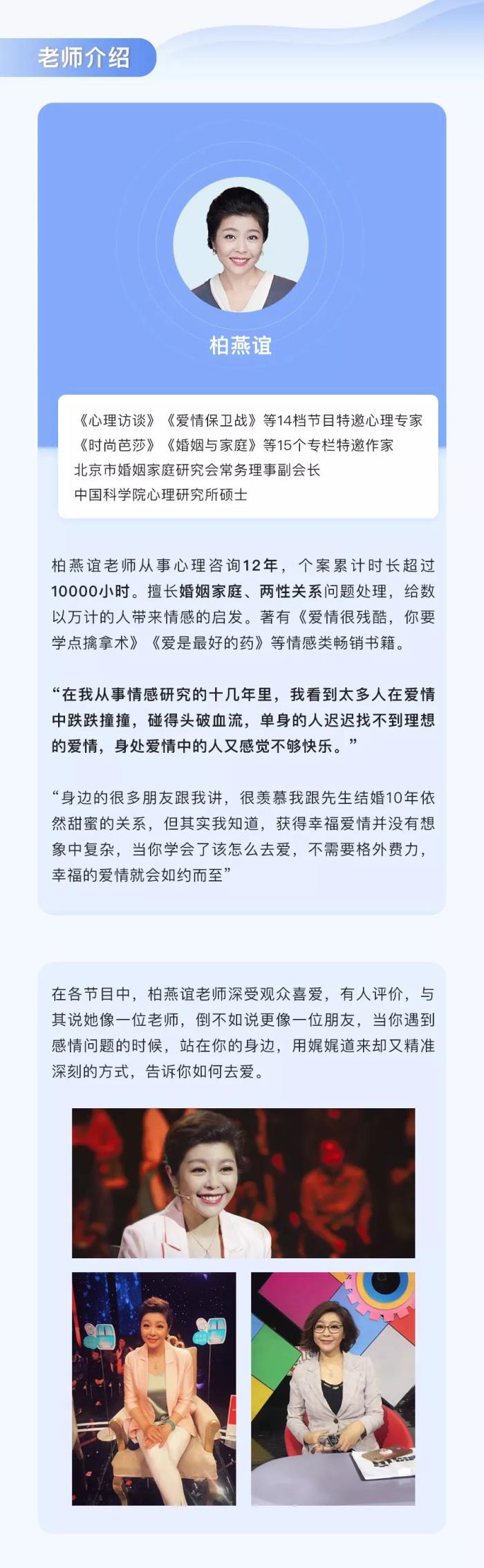 这次,《爱情保卫战》的心理专家、从事心理咨询12年的柏燕谊老师,她将把帮助上万人理清情感问题的经验,结合自身经营10年幸福爱情的心得,浓缩为《30堂爱情必修课 ,解锁幸福爱情的6种能力 》一课,帮你找到爱情最好的模样,和TA一起“一房、两人、三餐、四季”。