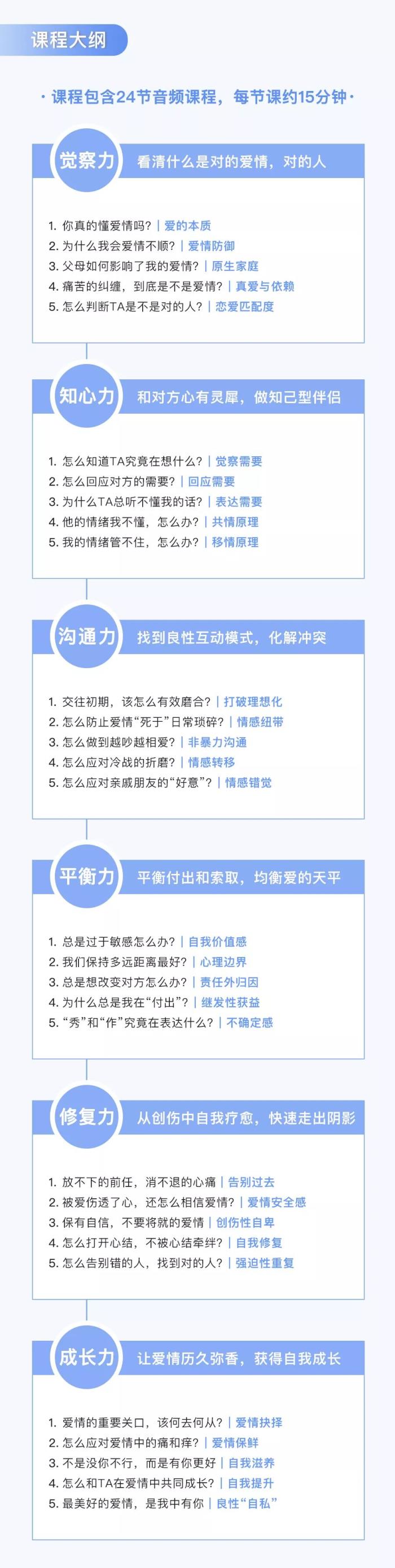 30堂音频课程,每堂约10-15分钟,另设答疑课1节,工作日每天更新1节