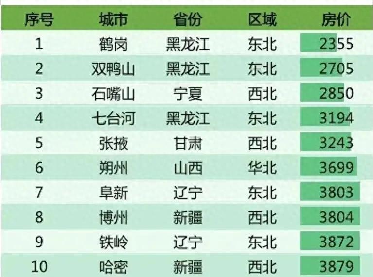 从图可以看出,平均房价最低的就是大名鼎鼎的黑龙江鹤岗市,平均房价为2355元,以一套100平方的房子为例,总价就是23.55万元,其实也没有网上说的那么低,不存在说两三万就能买到一套的情况,网上那些几万块一套的大都是步梯顶楼,或者是安置房,老破小等比较特殊的,如果是正经的商品房也是一个比较正常的价格的。