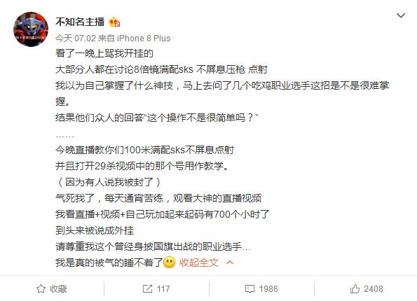 卢本伟在直播吃鸡的时候又被许多观众弹幕质疑开外挂,8倍镜满配sks 不屏息压枪 点射,等等词汇不时出现在屏幕之上,而随后卢本伟小号发微博声称自己不可能开挂,请大家尊重我这个曾经身披国旗出战的职业选手…