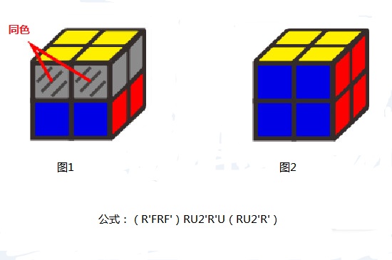 复原上层四个角块的时候,观察有没有两个侧面颜色相同的情况(如图1),如果是就旋转到左侧,根据公式完成复原。如果不是,可以随机做一次公式翻转后,会出现相同颜色的色块,此时再根据公式重复一遍就可以了。