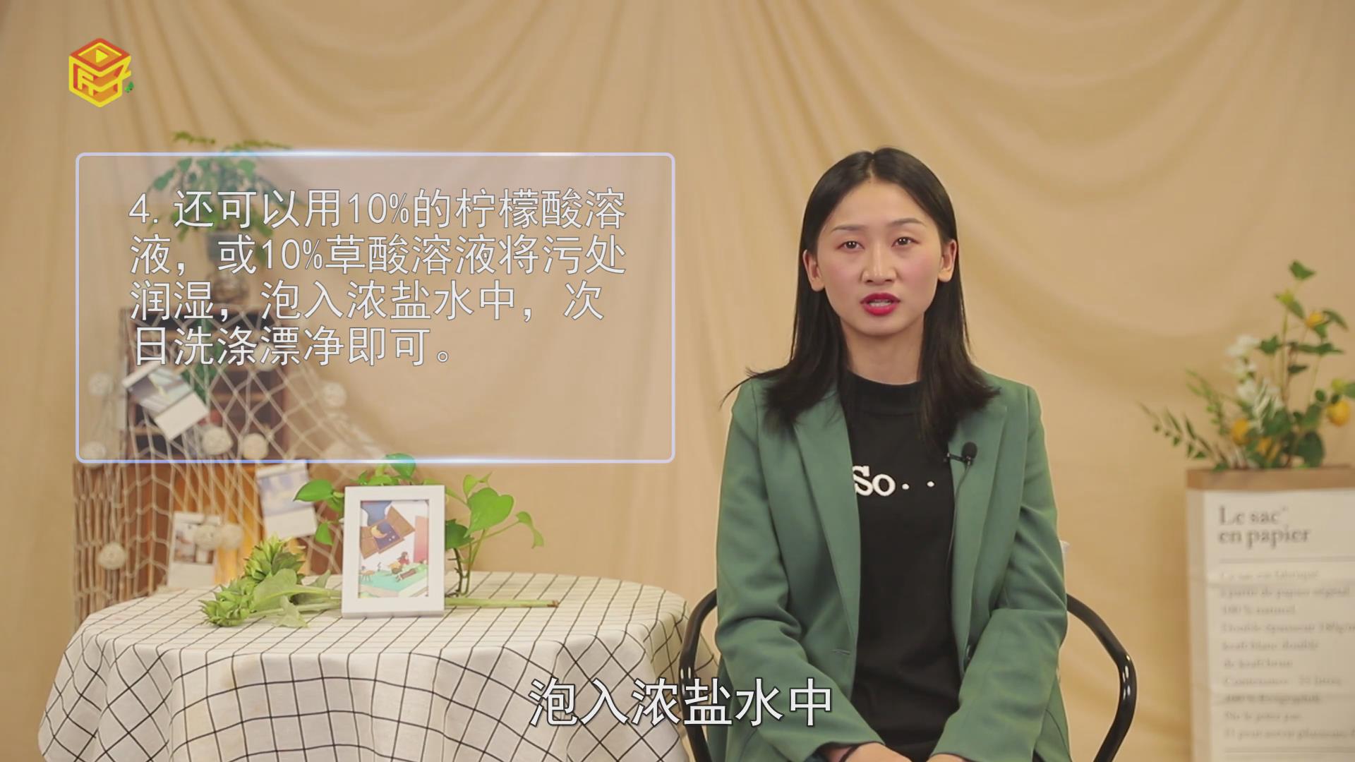 4.还可以用10%的柠檬酸溶液,或10%草酸溶液将污处润湿,泡入浓盐水中,次日洗涤漂净即可。